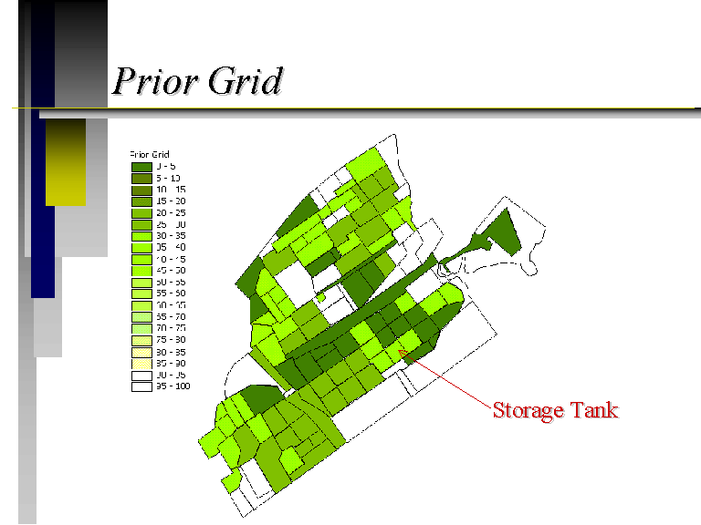 We can also use the fractions to calculate a probability that there will be no hits in 20 samples. Assuming that if there is one hit in twenty samples, some sort of action will be required, then this is the probability that an area will be OK. Light areas we do not expect to have a problem in, and dark areas we do. The middle areas we are not as sure about, and more data might be useful there. If you look at the storage tank, you see we are somewhere in the middle. But after you include the soil data,...