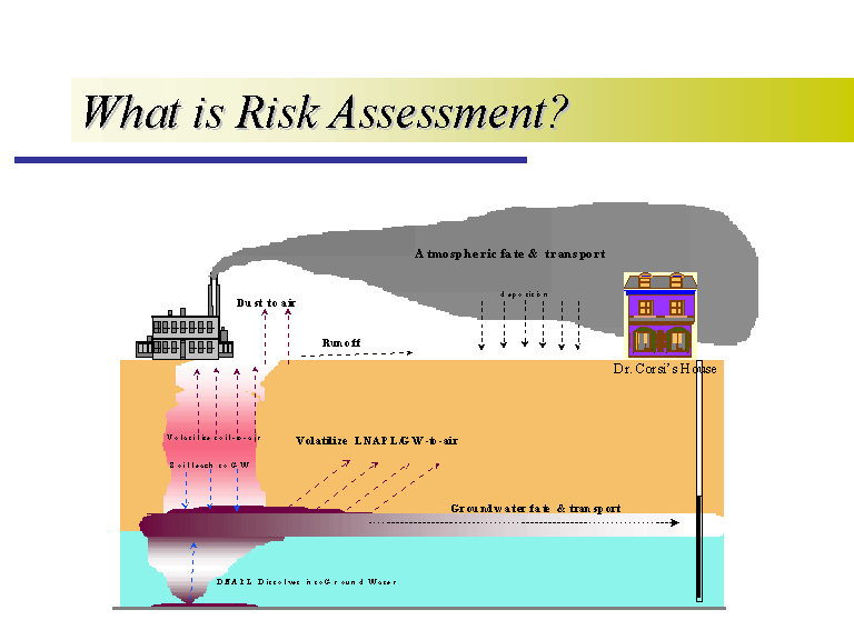 Risk assessment is the PROCESS of evaluating the risks associated with the presence and fate and transport of chemicals in the environment. It involves analyzing the sources of a release: when a release occurred, how much was released. It involves analyzing the transport of chemicals in the environment. You can see some of the potential transport pathways in this figure. Risk assessment also involves analyzing the risks to human and ecological receptors based on the exposures to different chemicals of concern. Each source can be associated with multiple transport pathways, and each receptor could be affected by many exposure pathways.