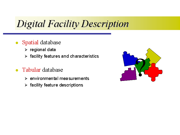 More specifically, the digital facility description is the description of natural and man-made features and information about physical, geological, hydrological, and chemical characteristics of the facility and region. The first major component of the digital facility description is the spatial database that consists of the GIS coverages of regional and facility geographic features. Regional characteristics include land use, soil data, and climate data. Facility characteristics include storage tanks, sewer lines, and surface cover. The coverages needed for the analysis were determined up front based on the questions that are to be answered by the applications -- i.e., what exposures and therefore what risk are we trying to characterize?