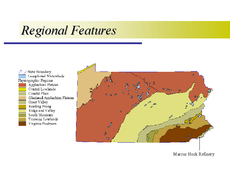 There is an incredible amount of free spatial data available on the internet, and I was able to build the regional database almost entirely from downloading web data. Here you see a map of physiographic regions and exceptional value watersheds in Pennsylvania. We have compiled about 40 regional coverages for this area, and all coverages have been projected into the Pennsylvania State Plane system so that all features, both on regional and facility scales, will line up properly.