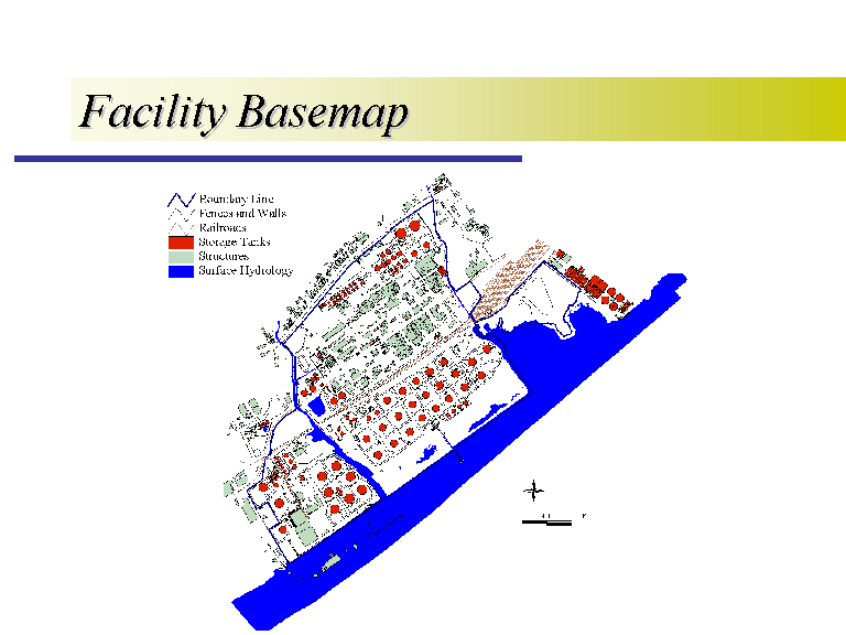 Once I received the coverages from the survey company, I built the facility basemap. This figure shows the facility structures, storage tanks, and surface hydrology. The Delaware River runs along the southern boundary of the site, and there are also two creeks that wind through the facility. You will also notice that features were mapped within 250 ft. of the boundary line. On the northern boundary of the property, there is a residential neighborhood and a school, so there are a lot of potential receptors. There are also a lot of sources. Each storage tank and each process unit could be a source. All of the sources and receptors will be incorporated into the site conceptual model being developed by Dr. Gilbert and Lizan Koerner. Similar to the regional database, there are about 40 facility coverages, and each coverage has an associated attribute table. For instance, for the storage tank coverage, we know each tank id and what is stored in each tank. So this gives you an idea of the amount of information we have compiled for this site.