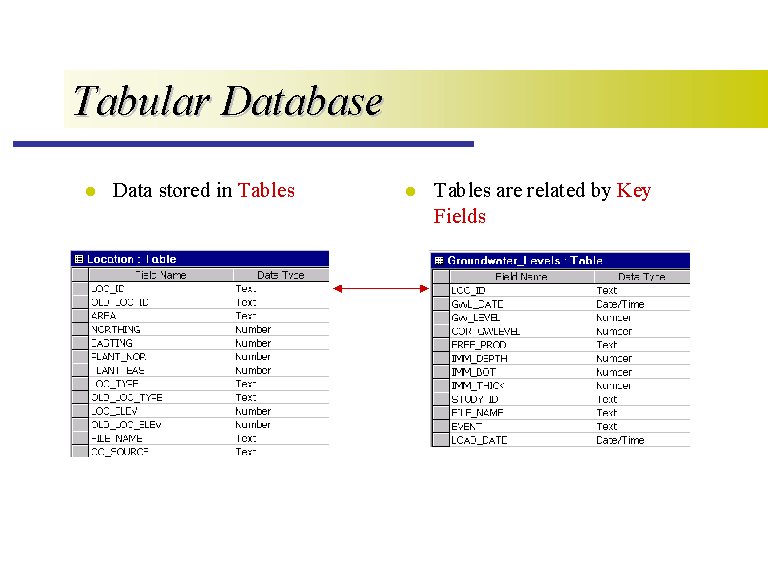 Tables are related in the database through key fields. In this example, the location table is linked to the groundwater levels table through the common LOC_ID field. When tables are relationally linked, queries can be set up to pull specified information from multiple tables. For example, a query could be set up to determine all the groundwater measurements taken from monitoring well #5 in 1996.