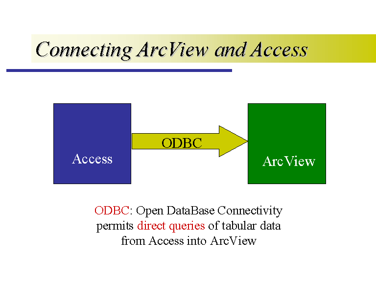 We can then use an Open DataBase Connectivity driver to import data from a table or query in Access to a table in ArcView, which is the GIS software we are using for this project. The procedure is simple, and it allows for the integration of tabular and spatial data. Once a table has been imported into ArcView, it can be joined to an existing coverage or used to create a new coverage, because remember that the location coordinates are present in the database. Every time the ArcView project is opened, the database will be requeried, thus obtaining any updated information.