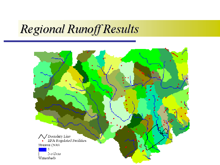 Here is the regional runoff model which was created using the Watershed Delineator extension to ArcView and some of the regional data I obtained in the data development phase. Each green area is a separate watershed and the blue lines are delineated streams. With these results, we can look at the facilities in each watershed for the two creeks and then use some NPDES permit information to calculate background concentration levels in the creeks upstream of the refinery.