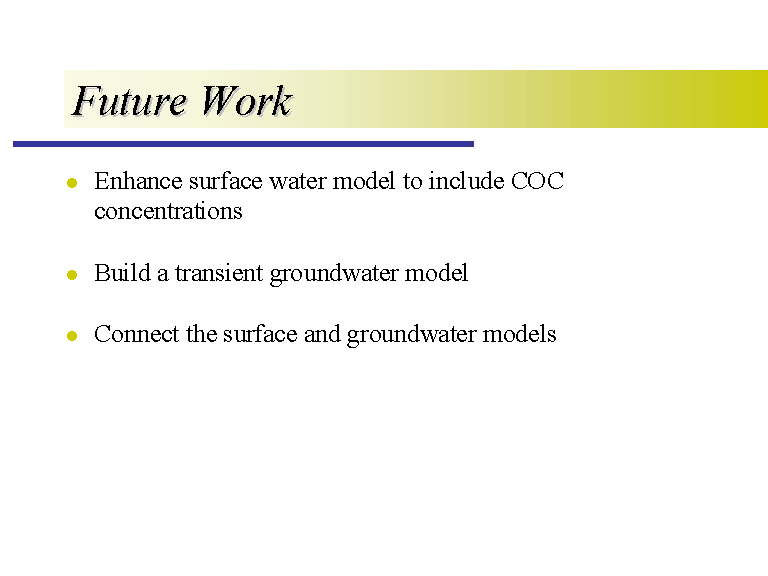 As far as future work, I plan to enhance the surface water model to include chemical of concern concentrations which it currently does not. I would also like to build a transient groundwater model that includes recharge variations, tidal stages, and different hydraulic conductivity zones. Eventually, the groundwater and surface water models will be connected to each other and also to the site conceptual model so that particular exposures can be calculated. My thesis will cover the construction of the digital facility description and example applications.