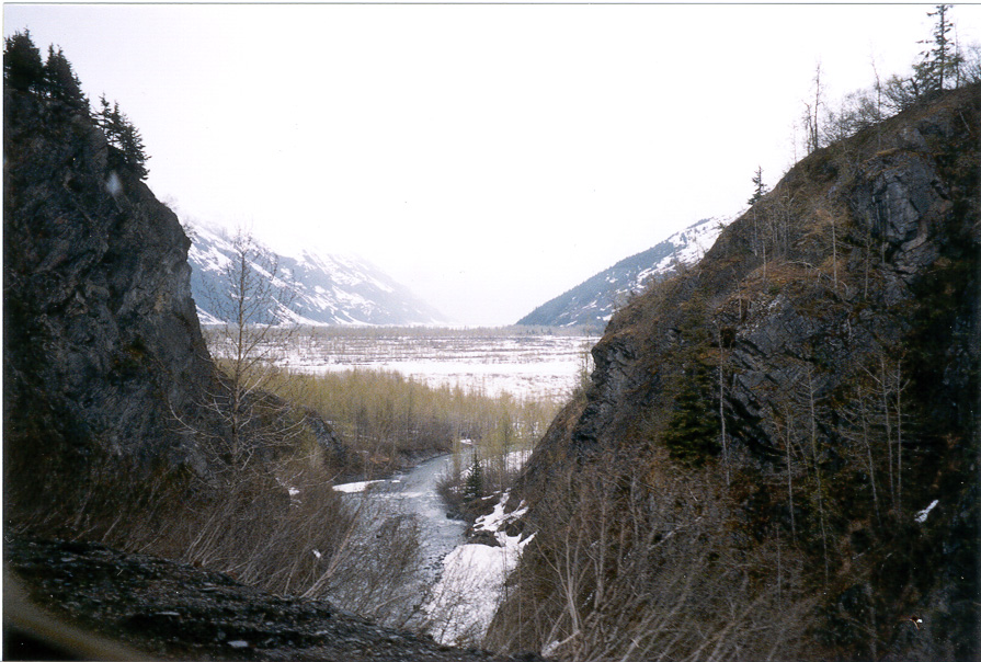 | A scene from the window on the train ride to Seward. We kept jumping from our seats to run back and forth to each side of the train to take pictures of snow, glaciers, mountain goats and moose. | The
