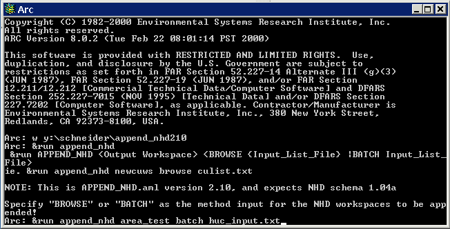 Aml stands for Arc Macro Language. Macros are used in GIS as they are used in any other program, to simplify processing and to perform calculations and other activities that would otherwise be too time consuming. The Append_NHD version 2.10 does exactly this. It simplifies the connection and integration of adjacent NHD workspaces. As mentioned above, the NHDinArc presents data for each 8-digit Cataloging Units (CUs) created by the USGS. However, it is sometimes necessary or desirable to deal with data on a larger scale, such as run a network trace for an entire watershed and not just one HUC unit.