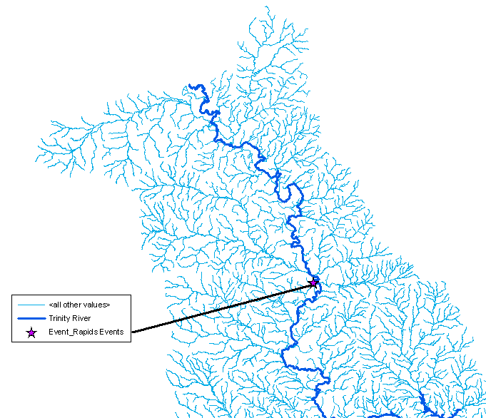 Route Events are occasions located along a route. To create a route event one must first decide on what one would like to symbolize with the route event. It was decided for this study to reference two rapids that are located on the Trinity River in the focus area. The image below shows the location of the points.