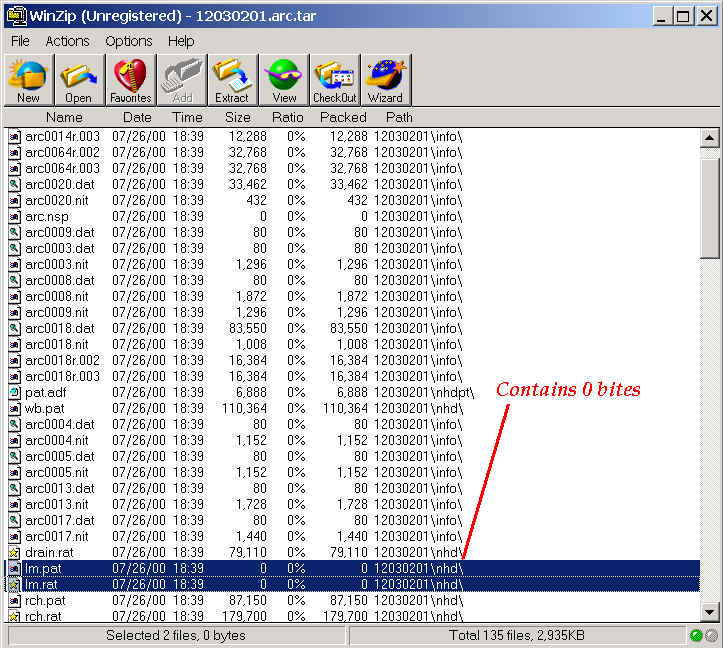 The first step in properly using Append_NHD is to use the correct data. Of course one might wonder where one could get wrong data if we are using a macro especially designed for the NHD dataset. It is not a question of the source of the data but the manner in which the data is unzipped. The workspaces must be unzipped using either Winzip Version 8, or UNIX gzip and tar, or the gzip.exe and tar.exe DOS executables to uncompress and untar NHD data. Winzip Version 7 does not uncompress files if they have 0 bytes of information. Append_NHD requires that the workspace being appended contain the basic set of NHD features classes, NHD feature attribute tables, and associated NHD tables that are described in the section above. In certain HUC units many of the features are blank because information is not available or pertinent for that workspace. Therefore it is important to use the correct program to unzip the files. The image below shows Winzip v. 8 and two of the zero bite files that were decompressed.