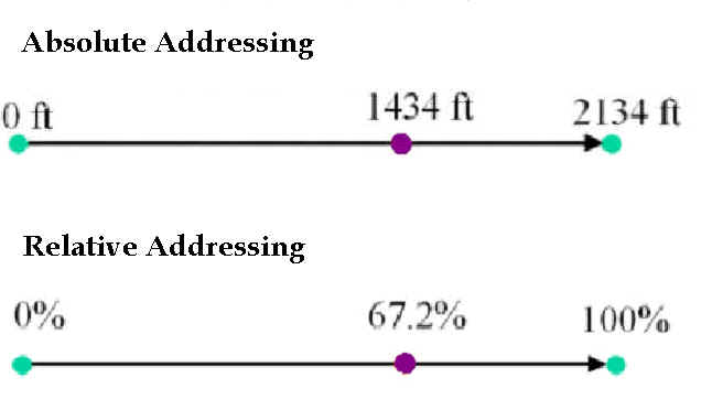 Linear reaches have a relative measure assigned to them that starts with a value of 0 at the downstream end of the reach and extends to 100 at the upstream end of the reach. Discontinuous reaches, to distinguish them from linear reaches, have a measure from 100 to 200 applied in the same fashion as for linear reaches. Branched reaches use a methodology that combines the addressing used in linear and discontinuous branches. If there is a distinguishable main path, it is assigned values from 0 to 100 as for a linear reach. The branches are then given measures like those used for discontinuous reaches from 100 to 200.