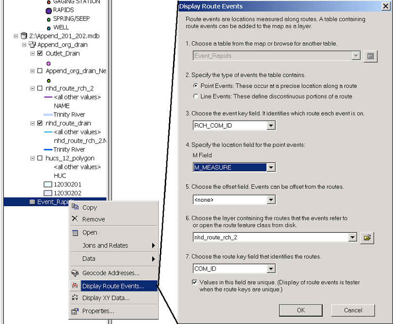 When creating the table it is easiest to import the fields that are used with the NHDPT coverage and then just edit the out the fields that are not needed and add the ones that are needed. Once the table is created, it is then added into the map that contains the reach on which the events shall be referenced to. The values, that were obtained earlier, are added using the Edit Toolbar. Once the table is created and the values inputted, it is time to Display the Route Events. Simply right click on the table and select Display Route Events. Select the correct entry for each field and press OK.