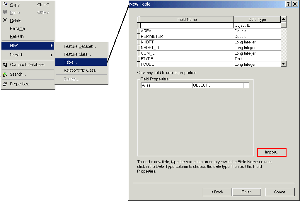 Once the points have been decided upon, the m-value for the points must be determined as described in the section entitled 'Finding the Linear Address.' Two other pieces of information that are important to note when creating the route events are the ID of the point and the ID of the reach/polyline M on which the events will be located. When working with the NHD these IDs are the Com_id and Rch_com_id respectively. The next step is to then create a table in ArcCatalog with the information collected.