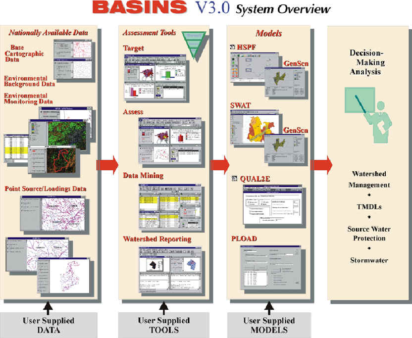BASINS stands for Better Assessment Science Integrating Point and Non-point Sources and was developed to aid in the determination of TMDLs. The BASINS programs are designed to investigate water quality conditions in water bodies and in themselves are not models. BASINS provides an interface that allows the user to interact with point and non-point source pollution models in GIS based environment. The program Arc View is utilized to upload GIS data from the BASINS database, which is provided by EPA’s Office of Science and Technology. The four models available with BASINS 3.0 are SWAT, QUAL2E, PLOAD, and WinHSPF. GenScn is a program provided to interpret the outputs from WinHSPF and SWAT. In addition, BASINS 3.0 contains several new functions, which include an automatic delineation tool that uses DEMs to create watershed boundaries, a NHD-import tool that downloads and formats the NHD from the web, and a watershed report function for land use, topography, and hydrologic response units.