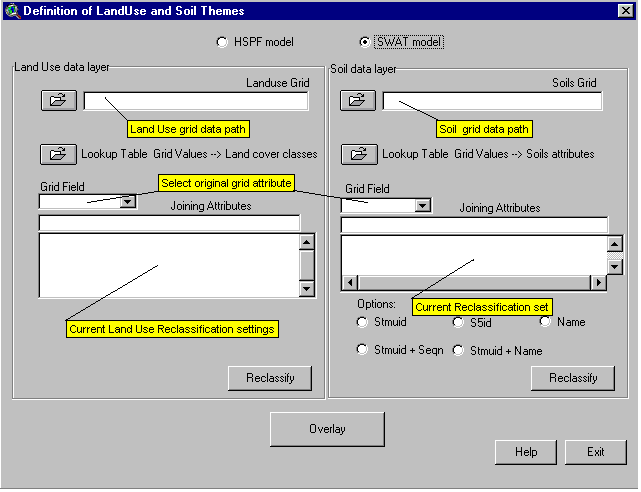 As described in the model overview the land use and soil distribution is an important factor in the application of SWAT. The Land Use and Soils Classification and Overlay tool is helpful in loading the land use and soil data, which is then placed in the current projection. The data can be in either a grid or a shapefile. For the delineated watershed the land use soil combinations and distributions are determined. Once this is complete the HRUs can be calculated. The image below shows the interface with an explanation of the fields and actual data input. Also, the Land Use and Soil grids created are shown below.