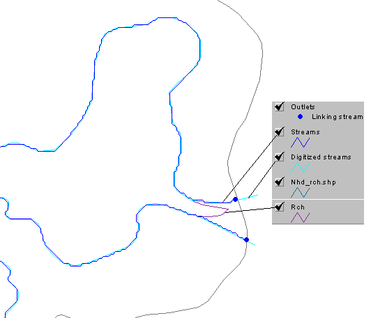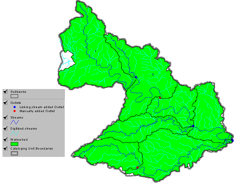 In addition to specifying the extent of the analysis, the analysis cell size was set the same as the NED DEM. This created more cells in the new grid created from the BASINS 2.0 polygon, which created a more detailed DEM. This DEM was specific enough to allow for the delineation of the subbasins. Just one other file had to be modified to allow for the delineation of the watersheds. At the outlet of the cataloging unit the NHD shapefile did not flow out of the CU but formed a v shaped loop that did not allow for flow out of the cataloging unit. The shapefile was edited to split the line and direct the lines outside the CU. The figure below shows that the shapefile and the changes made to allow for watershed delineation.