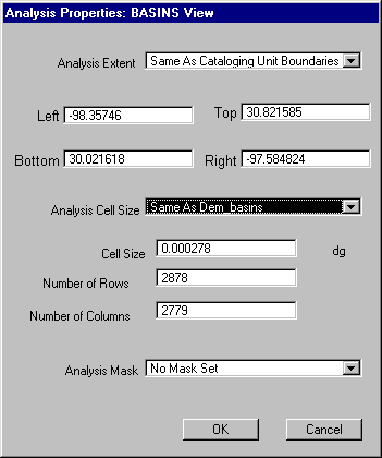 A solution was found that allowed for the delineation of the watersheds. In the previous conversion of the BASINS 2.0 DEM polygon to a grid the analysis extent had not been detailed. The analysis extent specifies the window that will be used for calculations with Spatial Analyst. The image below shows the Analysis Properties interface that allows for the definition of the analysis extent.