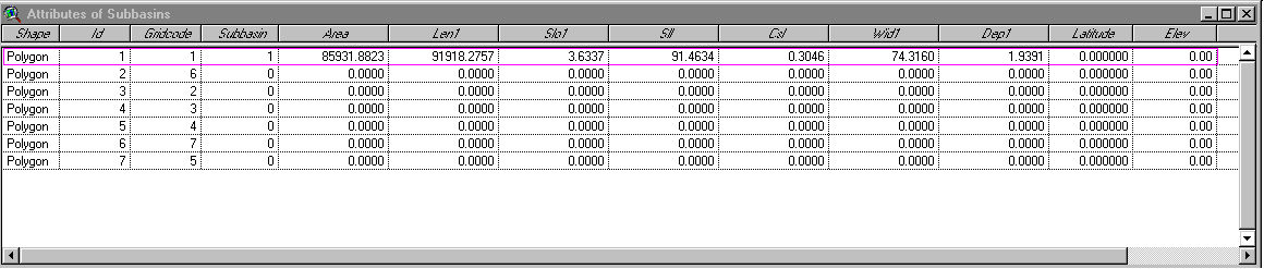 One interesting thing to note in this figure is that only two of the subbasins are labeled, 1 and 0. In addition, the attributes of the subbasins are all given values of zero except for subbasin 1 as can be seen below.