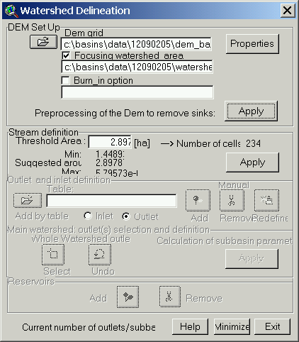 To delineate the watersheds, the subbasins as explained above, two options are available. One is a manual watershed delineation tool and the other an automatic version. The automatic version was utilized in this project. This step is a very important step that determines the success of future phases of the model application. The screen shot below shows the interface for the automatic watershed delineation tool.