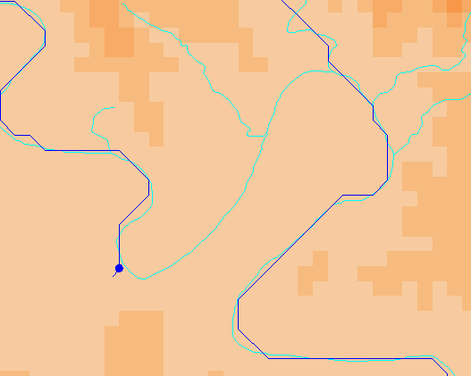 The first step is to select a DEM grid. The DEM provided with the BASINS 2.0 is a polygon, therefore Spatial Analysis was used to convert the polygon to a grid. The value used for the grid was the elevation in meters. The focusing watershed area creates a buffer, designating the area of the DEM that should be used to delineate the subbasins. The outline of the CU was used as the focusing area. The burn-in option allows user to specify a shapefile that will direct the flow from the DEM to the correct location. The reach file of the NHD was converted into a shape file and then was selected as the stream that would be burned in to the DEM. However, some errors were encountered in the delineation of the watersheds with this DEM. The program has a step in the delineation process that creates the streams that will be used in later parts of the delineation. The DEM available was not exact enough to allow for the creation of the streams that followed the NHD. The following image is an example of the problem. The bright blue lines are lines created by the delineation 78749tool and the light green lines are the NHD shapefile.
