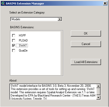 To activate SWAT and it's needed extensions, you simply go to the BASINS extensions area in ArcView and select the needed extensions. The following graphic shows the model extension category. Extension categories exist for watershed delineation tools, reports, and assessment tools to name a few.