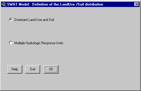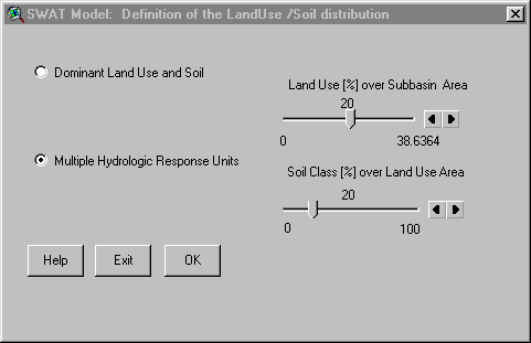 The next step is to compute the Hydrologic Response Unit distribution. The HRU distribution utility allows the user to specify the criteria for determining the HRU division throughout the subbasin. The interface for this step is located below. Each subbasin can have one or more HRUs. Either the dominant land use and soil in the subbasin can be used or HRUs can be defined based on the percent land use over the subbasin and the soil class percent over the land use area.