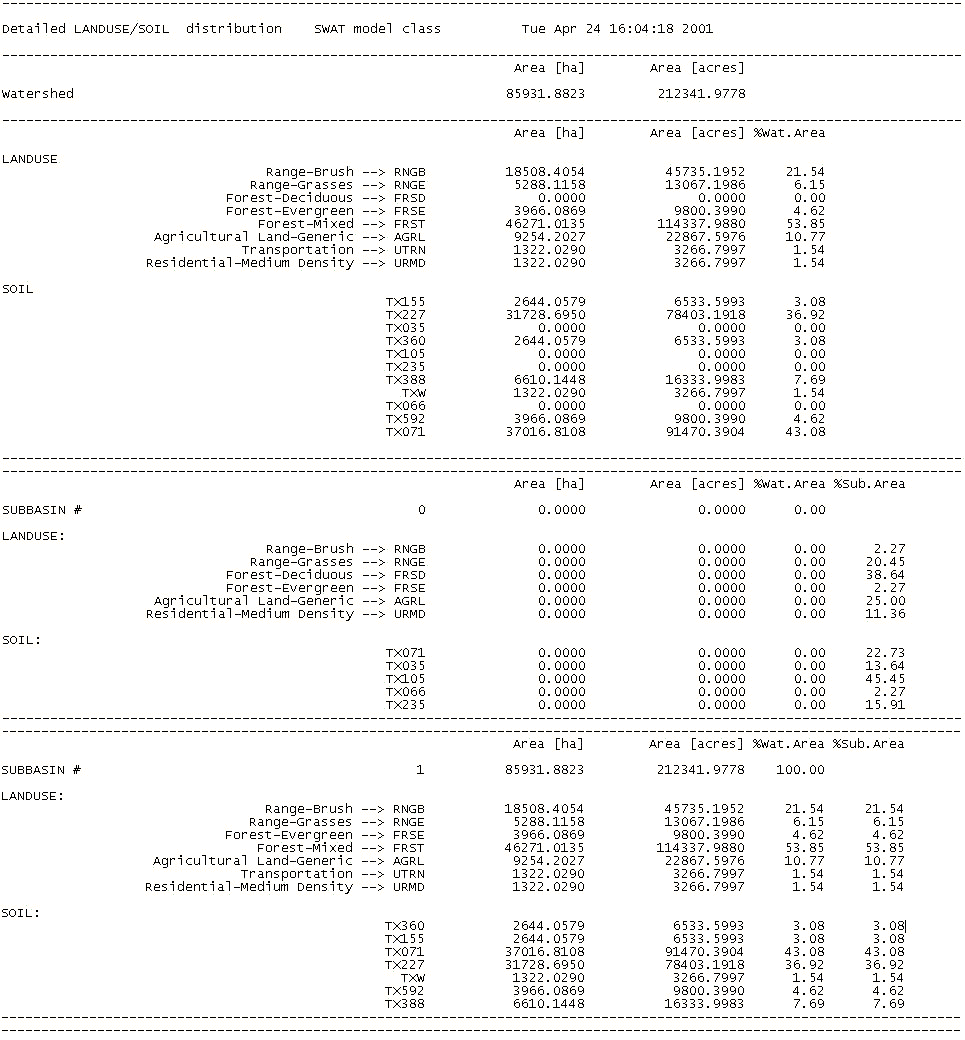 This is the point in the procedure when the strange delineation of the watersheds came into play. The soil input file could not be created because data was missing for multiple soil types. The data exists in the soil tables used to create the Land Use and Soil overlay but not in the report created by the Land Use and Soil distribution, which is used to generate the .sol file. The report is shown below and it can be seen that only nil values exist for subbasin 0, while subbasin 1 is correctly calculated.