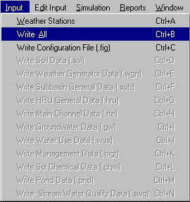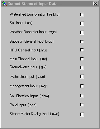 Creating the watershed input values is the first step in running SWAT. The program allows the user to write all files or to individually write the files. The status of the input files is tracked with Current Status of Input Data message box, when a file is complete a check box is placed next to the file.