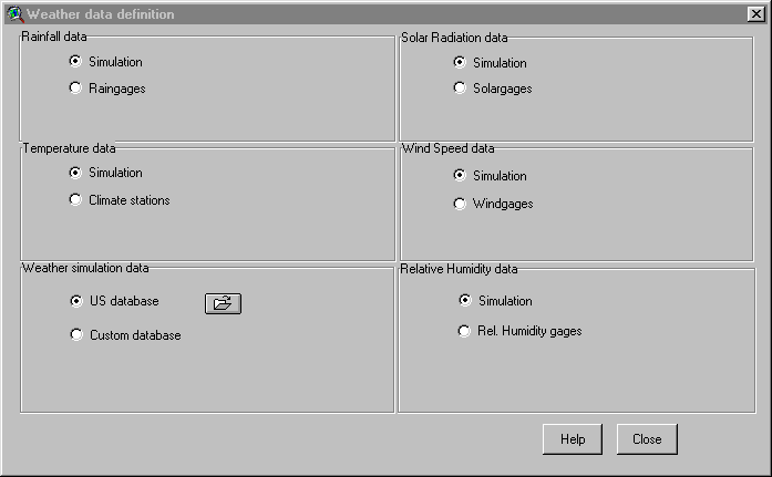 Once in the SWAT View, the weather data can be stipulated and the input writer can be utilized to build the watershed input values. The weather data generation allows the user to input their own data or simulation data. Weather data from a US database contains default data from nearby weather stations.