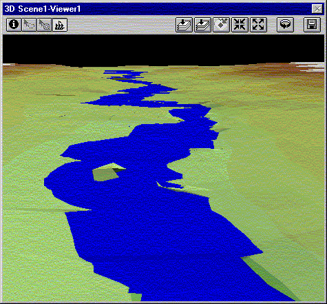 The water surface line theme can be used to create a TIN model of the floodwater surface. If the HEC-RAS model was set up correctly, the water surface extent will not exceed the cross-section extent. As such, the cross-section bounding polygon will serve as the outer boundary of our water surface TIN. Activate the water surface theme ("Water3d.shp") and the bounding polygon theme ("Boundary.shp") in the legend bar and select Surface/Create TIN from Features. In the TIN creation window, input the water surface theme into the TIN as hard breaklines, and the bounding polygon theme as a hard clip polygon and then click OK. The default color scheme really doesn't look much like floodwater, so if you like, you can load the legend named "water1.avl." When viewed in a 3D scene in conjunction with the terrain TIN, flooded areas can be seen: