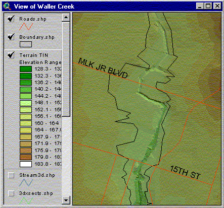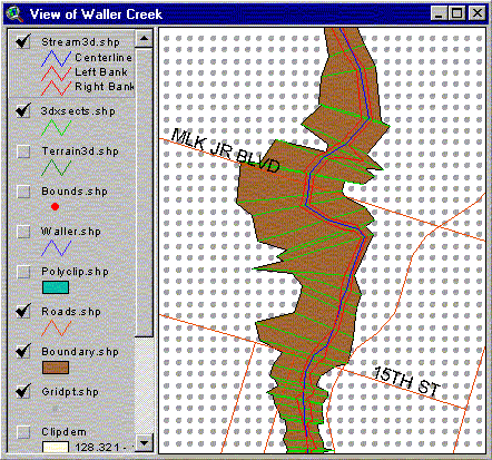 In actuality, Waller Creek flows from north to south. In this case the digital stream is oriented correctly, from downstream to upstream. If this wasn't the case, the direction could be reversed by making the theme active, and selecting Flood-Utility/Flip Polyline.