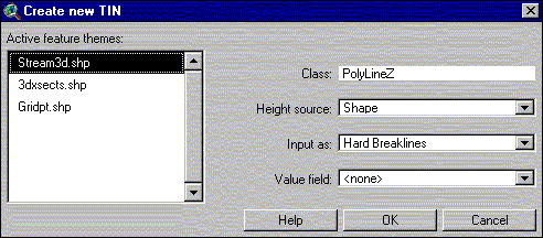 the themes "Stream3D.shp", "3dxsects.shp", and "gridpt.shp". Then select Surface/Create