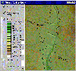 The theme "Stream3d.shp" is a three-dimensional line shapefile of the stream centerline and banklines. These data will be enforced in the TIN as breaklines. Fill in the window as shown in the graphic. Next, click on the cross-section line theme "3dxsects.shp" on the left side of the window. In the "Input as:" drop down list, select "Mass Points." Finally, click on the DEM point theme, "Gridpt.shp." Select "Mass Points" from the "Input as:" window and "Grid_code" as the "Height Source." Now click the OK button to create the TIN. When ArcView has finished processing the data, the TIN theme will appear in the legend bar. Click the check box to display it. The default color scheme is not ideal for observing the TIN. Double click on the TIN's legend bar to open the TIN legend editor. First click off the check box next to "Lines" and then click the edit button in the "Faces" part of the window. This will open the regular legend editor. Click on the Load button and choose "land.avl." Click OK in the Load Legend" window and then apply in the legend editor. (The image captured from the screen is much grainier than the actual image in ArcView.)