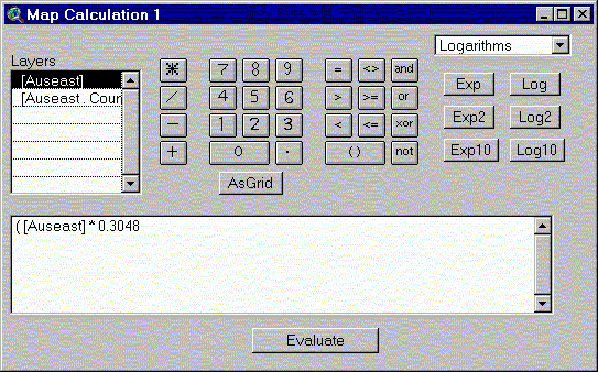After clicking OK, a new grid will be created, this time with the elevations in meters. Highlight the new grid in the legend bar, and save the new grid under the name "auseast1" by selecting Theme/Save Data Set. Although you've given the new DEM a name, the legend bar will still show "Map Calculation 1." You can change the legend bar name by selecting Theme/Properties.