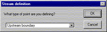 You can display the roads theme and/or the orthophoto to help locate the definition points. But for now, we'll just use the roads theme. So turn of the orthophoto theme in the legend bar. To begin, find the intersection of 26th Street and Waller Creek, and click the mouse at that spot. When queried for the type of boundary, select "Upstream boundary."