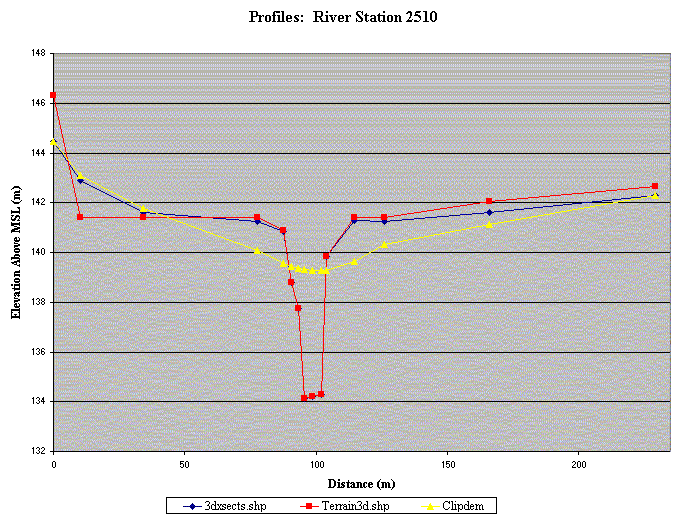 We're now ready to begin the terrain modeling. Select Floodmap/Re-Sample Cross-Section Elevations. When queried, choose "Terrain3d.shp" and "auseast1" as the inputs. This process could take a few minutes--the elevation of every cross-section point outside of the main channel is being recalculated. To help visualize the result of the cross-section resampling, a tool with which to create three profiles of any given cross-section has been developed, based on the original cross-section, the DEM, and the resampled cross-section. Select Flood-Utility/Compare Cross- Section Profiles. Select the appropriate themes and the cross-section (river station) you'd like to profile. I've used river station 2510. The coordinate data is written to an ASCII text file that can be plotted using Microsoft Excel. Save the text file and open it in Excel. The Excel text import wizard should engage. The text file is comma delimited, so click next and in the second window check the comma box, followed by the finish button. With the data now in a spreadsheet, they can be graphed on an x-y scatter plot: