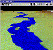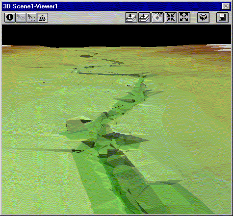 The water surface line theme can be used to create a TIN model of the floodwater surface. If the HEC-RAS model was set up correctly, the water surface extent will not exceed the cross-section extent. As such, the cross-section bounding polygon will serve as the outer boundary of our water surface TIN. Activate the water surface theme ("Water3d.shp") and the bounding polygon theme ("Boundary.shp") in the legend bar and select Surface/Create TIN from Features. In the TIN creation window, input the water surface theme into the TIN as hard breaklines, and the bounding polygon theme as a hard clip polygon and then click OK. The default color scheme really doesn't look much like floodwater, so if you like, you can load the legend named "water1.avl." When viewed in a 3D scene in conjunction with the terrain TIN, flooded areas can be seen: