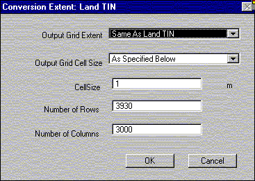 Now we have a TIN model for both the land surface and the floodwater. However, the floodplain delineation is more readily performed using the raster data model instead of TINs. In the raster domain, grid cells of water surface elevation and grid cells of land surface elevation can be easily compared using map algebra. As such, we need to convert both TINs to grids. Make the land TIN active and select Theme/Convert to Grid. Choose "landgrid" when prompted for a grid name. In the conversion extent window, set the Output Grid Extent to be the same as the land TIN, set the Output Grid Cell Size to "As Specified Below," and input the cell size as 1 meter: