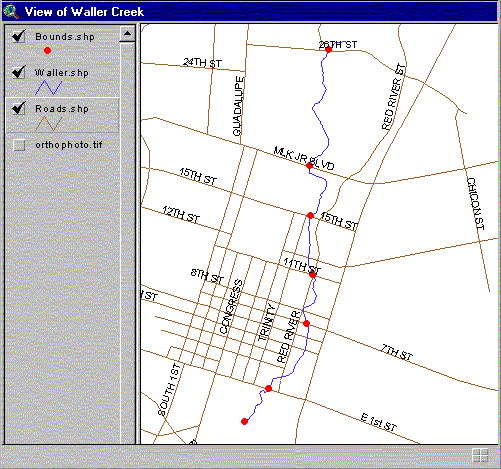 You can display the roads theme and/or the orthophoto to help locate the definition points. But for now, we'll just use the roads theme. So turn of the orthophoto theme in the legend bar. To begin, find the intersection of 26th Street and Waller Creek, and click the mouse at that spot. When queried for the type of boundary, select "Upstream boundary."