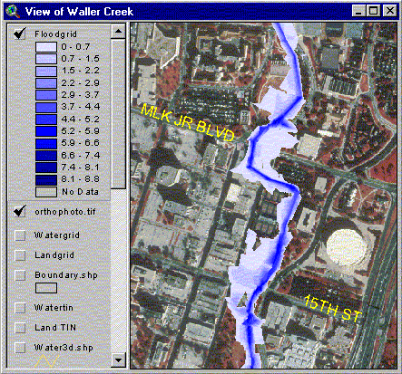 The data required for this exercise consist of an HEC-RAS output data file, ArcView shapefiles, and digital imagery, which can be downloaded as two zip files. Floodmap1.zip is a 0.5 MB file that contains the HEC-RAS and ArcView files. Floodmap2.zip is a 7.2 MB file containing digital orthophotography. The data will be used in this tutorial to construct a digital floodplain map of Waller Creek, located in Austin, Texas. Specifically, the zip files contain the following data: