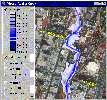 After clicking OK, ArcView will convert the TIN to a 1-meter resolution grid. Do the same for the water surface TIN. But this time, name the grid watergrid and set the Output Grid Extent to be the same as the water surface TIN. Now both surfaces are represented as grids. Before comparing the two grids, it's necessary to define the analysis extent. Select Analysis/Properties. Set the Analysis Extent to Same as Watergrid, set the Analysis Cell Size "As Specified Below" and input it as 1 meter. Then select Floodmap/Delineate Floodplain. The script will compare the two grids and create an output grid consisting only of areas where the floodwater elevation exceeds the land surface elevation. For the floodplain grid, the color scheme "water2.avl" can be loaded from the legend editor. Add the orthophoto to the view as a basemap: