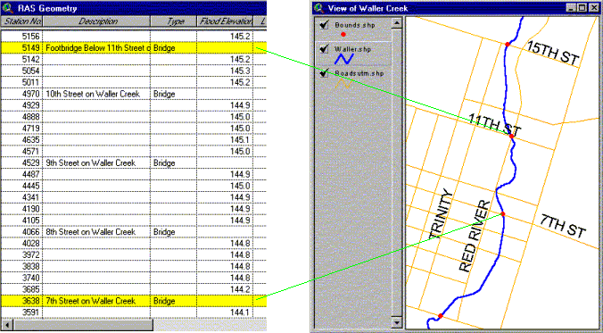 The stream definition points will form the backbone of the cross-section georeferencing process. Using the data table resulting from the data import step, the HEC-RAS data corresponding to the definition point locations will be associated with these map coordinates. For example, the table record for Waller Creek at 11th street will be connected with the definition point located at Waller Creek at 11th street. This concept is illustrated in the following graphic: