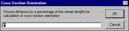 This input window is for a parameter that will determine the orientation of the cross-section relative to the stream centerline. Using a value of 0 will cause each cross-section to be mapped perpendicular to the stream, at the precise cross-section location. Using a zero value could cause some cross-sections to intersect near bends in the stream. As the orientation parameter increases, perpendicularity is determined based on a longer segment of the stream. For this tutorial, use the default value of 5.