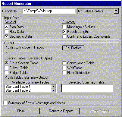 When you are finished setting up the window, click the "Generate Report" button. HEC-RAS will subsequently create an output file and save it in a location you designate. The resulting output file can be viewed in any text editor. Note the location where you saved the file, and exit HEC-RAS.