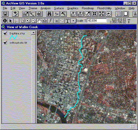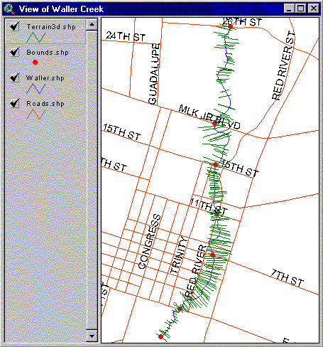 In actuality, Waller Creek flows from north to south. In this case the digital stream is oriented correctly, from downstream to upstream. If this wasn't the case, the direction could be reversed by making the theme active, and selecting Flood-Utility/Flip Polyline.