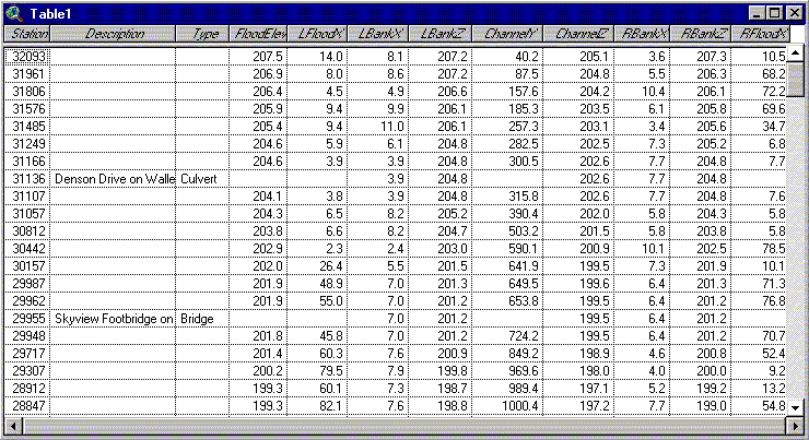 To select the relevant HEC-RAS data, return to Table1. Using the "Station" and "Description" columns as a guide, highlight the record for 26th Street at Waller Creek (Station 13167). Scroll down to select the remaining six records, holding down the shift key to select more than one record.