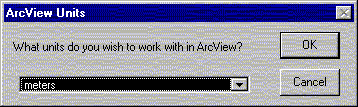 Next we will import the HEC-RAS data into our ArcView project. Go to the view window and select the Floodmap/Import HEC-RAS Data menu option. Before continuing, it is necessary to choose the units you'd like to work with. For this tutorial, the HEC-RAS model has units of feet. However, the GIS data (shapefiles, orthophotography, and DEM) are in units of meters. When queried by ArcView for the units, select meters: