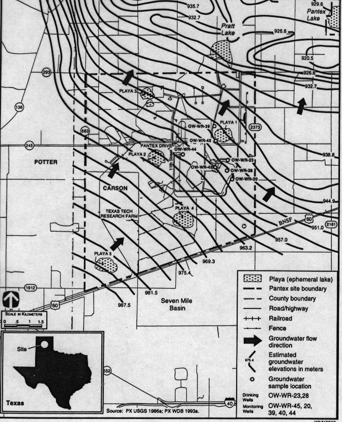 Pantex is located in Carson County, in the panhandle region of Texas. The region has a fairly flat topography, with numerous playa lakes. A playa lake, or basin, is a term describing numerous lakes in the region, usually less than 0.6 miles in diameter, that receive water runoff from the surrounding areas. Land that is not used exclusively by Pantex for operations is used by Texas Tech Agriculture Research for agricultural purposes. These consist of dry farming and livestock grazing. The land also contains one (1) residence approximately 3.7 miles southwest of the weapons fabrication facility.(DOE/EIS-0225)