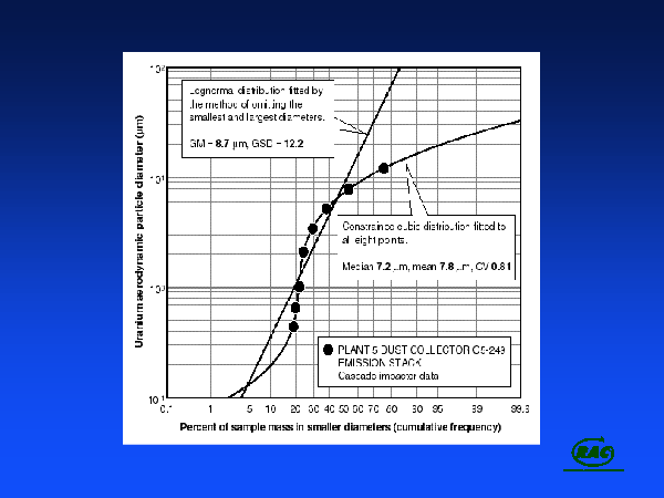 Particle size of the particles released was very important to defensible dosimetry. We located particle size measurements that had been made previously and generated a distribution to represent them. The result was a distribution that was not lognormal, as had been expected and that is typically assumed in assessments of this type.