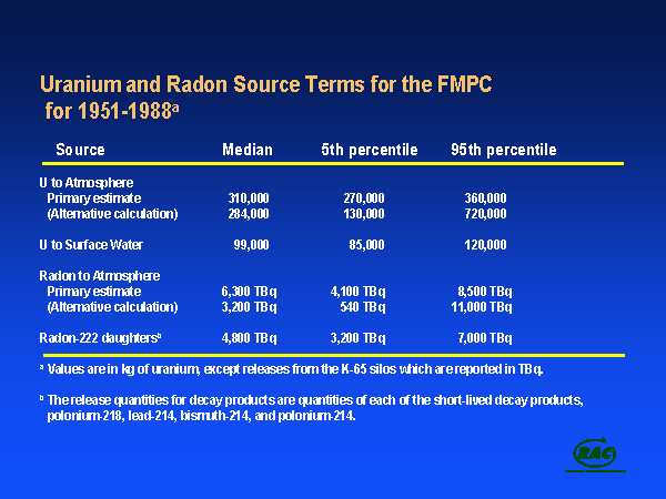 This slide shows our final estimates of uranium and radon released to air and surface water. Uncertainties are also shown. Although the amounts of uranium released are quite large, it is the radon that causes most of the risk, as will be shown later.