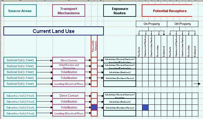 This exercise does not specifically require the use of computer software, however, an Excel spreadsheet has been provided as an example for documenting the exposure pathway decisions. The file sitecon4.xls can be downloaded from here: sitecon4.xls.